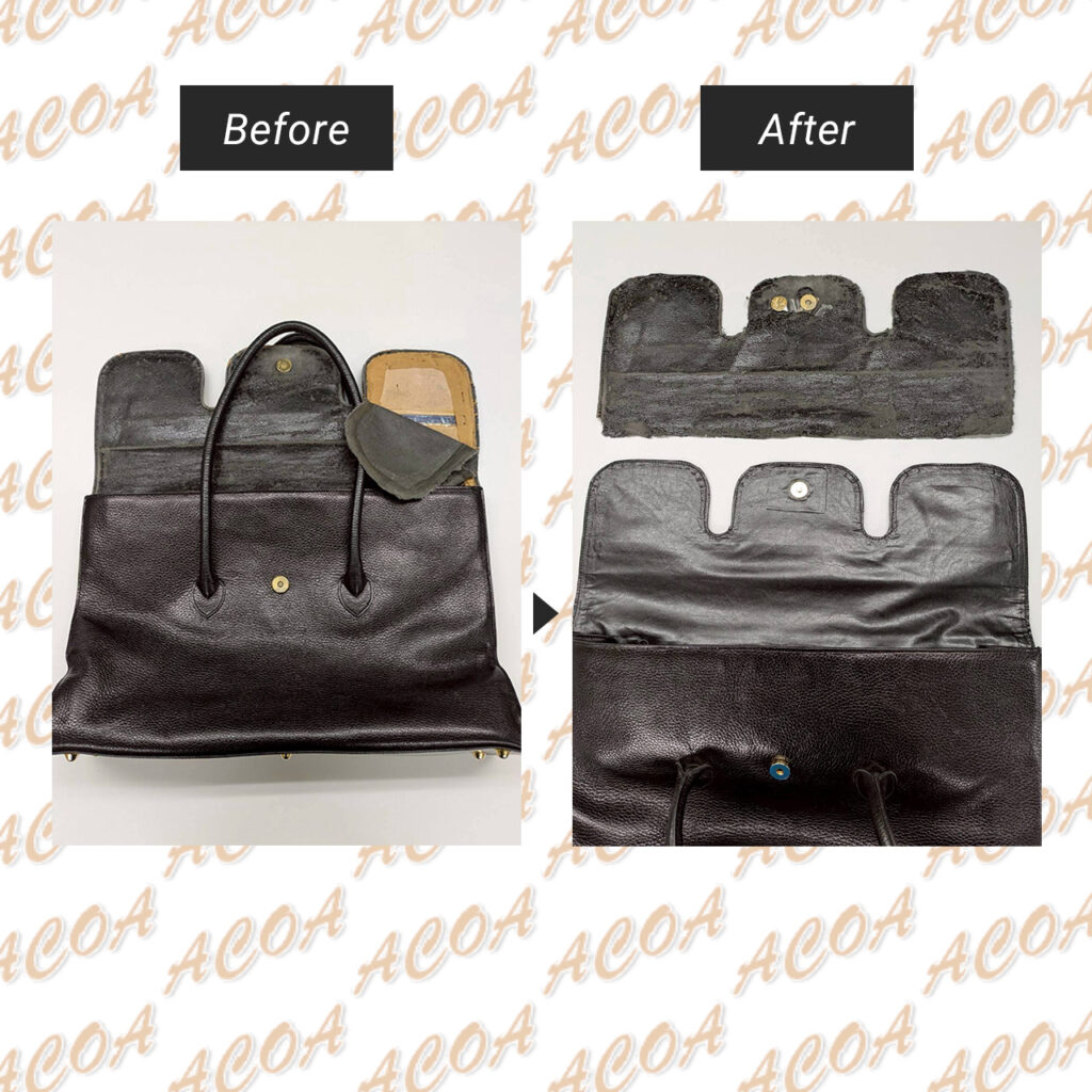 2025.09.30 バッグの修理、内側のべたつき カバンのフタの裏地取り換え カバンの蓋の裏地を取り替えました。使い心地を左右する見えない部分も丁寧に直し、快適にお使いいただける状態へ。修理やメンテナンスのご相談はお気軽にお問い合わせください。 Tweet Share