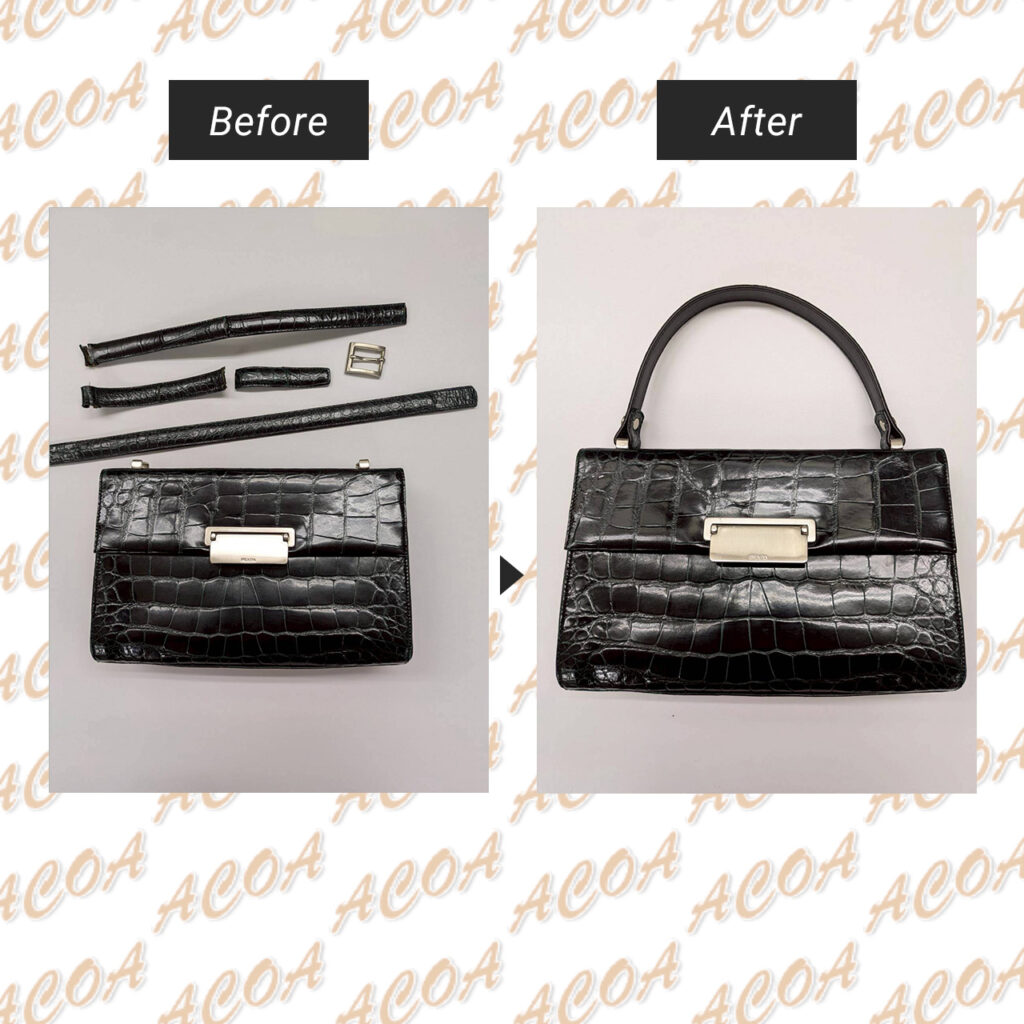 2025.09.30 バッグの修理、持ち手の修理 クロコのバッグ 持ち手修理 クロコのバッグで持ちてが破損していたため、クロコ皮を再使用し、裏側は新しい皮で修理しました。素材感を損なわず、強度も確保した実用的なリペアです。修理やメンテナンスのご相談はお気軽にお問い合わせください。 Tweet Share